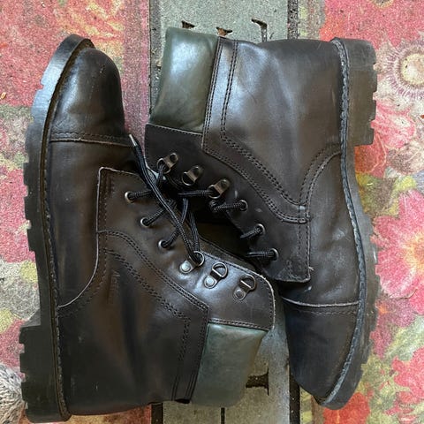 Tummanruskeat suht hyväkuntoiset talvijalkineet, sisämitta 128 cm (10,5). Kissatalous.