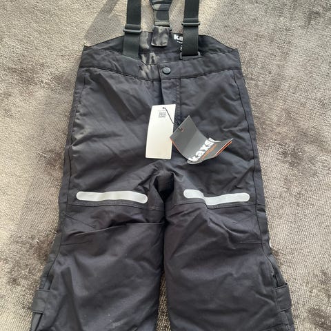KappAhl Kaxs Proxtec lasten toppahousut koossa 86, väri musta. Housuissa on säädettävät olkaimet ja heijastavat raidat lahkeissa näkyvyyden parantamiseksi. Soveltuvat unisex-lapsille ja tarjoavat suojaa kylmiltä säiltä.