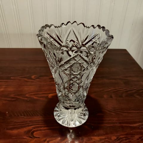Kristallikulho maljakko kirkkaasta lasista. Maljakko on korkea ja kapeamuotoinen, koristeltu leikatulla lasikuviolla. Soveltuu kukkien asetteluun tai koriste-esineeksi.