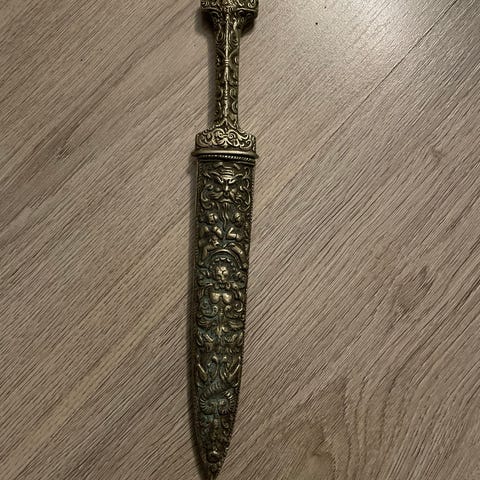 Miekka paperiveitsi, koristeellinen pillerirasia ja kirjanmerkki.