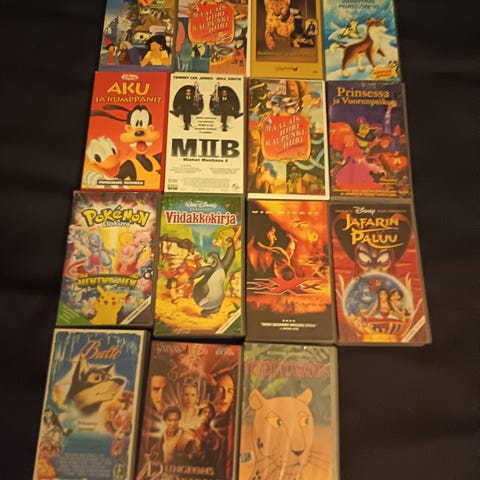 Erilaisia lasten VHS-elokuvia, sisältäen muun muassa Ti-Ti Nalle, Mikki Hiiri, Turtles, Muumit, Maija Mehiläinen, Katto Kassinen, Smurffit, Myyrä, Peppi Pitkätossu. Kanneton on titi-nallen seikkailuleiri. 3e/kpl tai useampi tarjouksena.