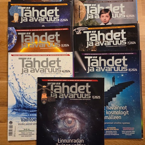 6 vuosikertaa (8 lehteä/vuosi) hyväkuntoisia Tähdet ja avaruuslehtiä. 8e/vuosikerta eli vain 1e/lehti. Avaruus, tähtitiede, astronomia. Postitus mahdollista.