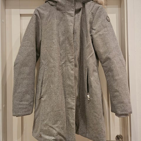 Luhdan valkoinen talvitakki karvareunushupulla.