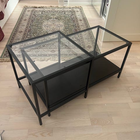 Myyn tämän mustan metallisen sarjapöydän. Pöydät hyvässä kunnossa, eikä päällepäin näy paljoakaan nuo muutossa tulleet harmilliset jäljet.