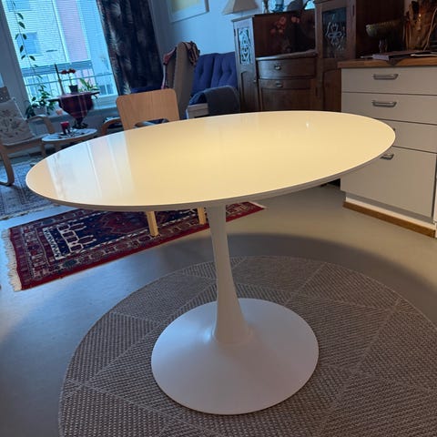 Myydään Jysk Ruokapöytä RINGSTED Ø100 (100x75cm), hyvä kuntoinen ja noin pari vuotta vanha.
