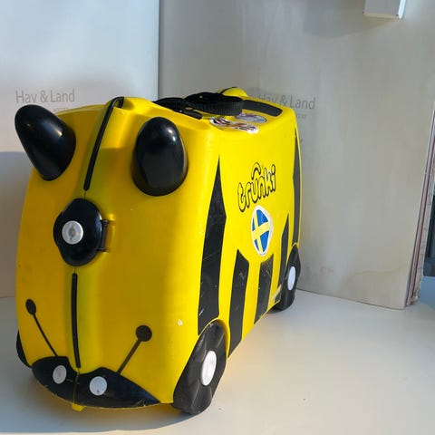 Trendikäs trunku pikkumatkustajalle. Väri pinkki. Voidaan kantaa tai vetää perässä. Lukittava. Sisältää avaimen. Tässä voi myös istua päällä.
