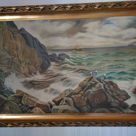 Pieni kehystetty merimaisemamaalaus. Teos on öljymaalaus tai akryylimaalaus.