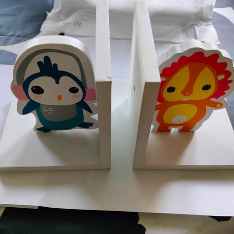 Myydään kuvassa olevat kirjatuet kirjahyllyyn. Valkoisen seinämän korkeus 15cm, pituus 14cm, syvyys 12cm, sinisen ukkelin korkeus pohjasta "tuntosarveen" 17,5cm. Kunto kuin uusi vaikka ovat useamman vuoden vanhat.