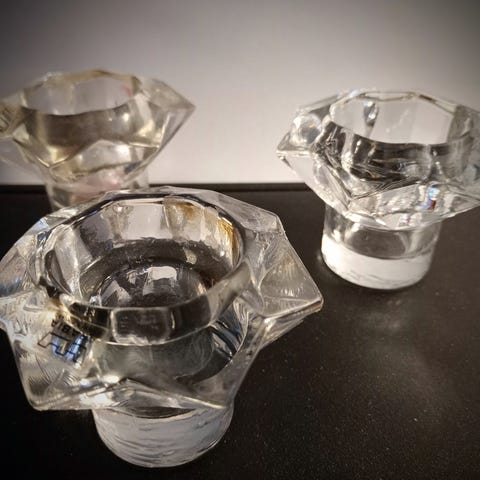 Nuutajärven lasin valmistama Tähti kynttilänjalka. Kynttilänjalan korkeus on 50 mm ja halkaisija 65 mm. Kynttilänjalat olivat tuotannossa 1970-luvulla. Tarra: Kruunu, Arabia, Wärtsilä, Finland. Kunto kuin uusi.