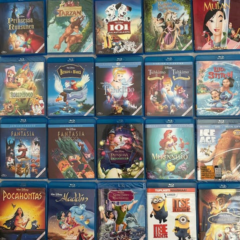 Kaikki suomeksi puhuttuja; ruotsi, englanti tekstitys/puhe myös (paitsi Smurffit).