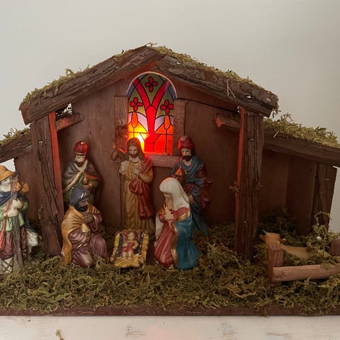 Kuvan jouluinen asetelma, kaikki kuvassa näkyvät tulevat mukaan. Koko laatikolla 39.5cm ja korkeus 10 leveys laatikolla on 14 cm . Mukana patterivalot.