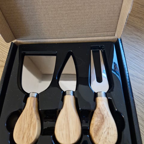 Käyttämättä jäänyt juustoveitsisetti puulaatikossa. Kannessa lukee "Clerical", josta saatu aikoinaan.