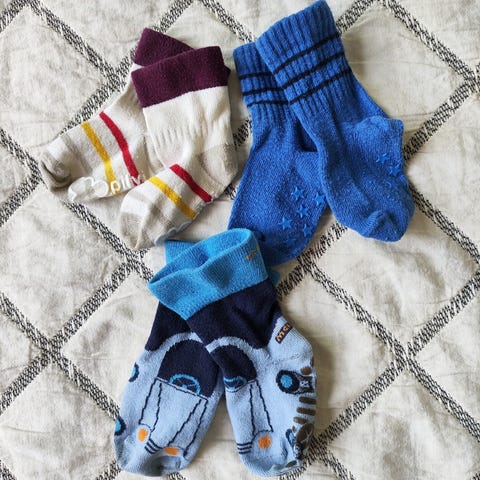 Paksut jarrusukat 3 paria koko 19-22. Aiheena: koira, auto ja raidalliset.