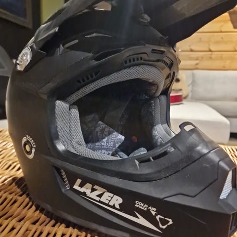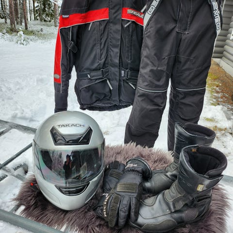 Pari talvea ajettu kengät, panssari, lasit sekä kypärä. Kypärä kolaroimaton