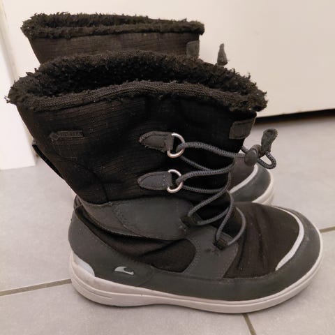 Viking lasten talvikengät, koko 31, unisex. Kengät ovat mustan ja harmaan sävyisiä ja valmistettu kestävästä materiaalista. Ne sopivat lapsille ja tarjoavat suojaa kylmiltä ja kosteilta sääolosuhteilta.