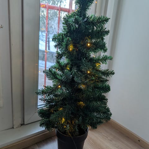Rustasta ostettu ja kaksi joulua käytössä ollut pieni joulukuusi. Valot ostettu viime vuonna, en valitettavasti muista mistä.