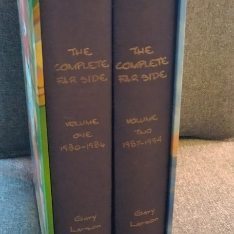 Pilapiirtäjä Gary Larsonin kaksi albumia, sivuja kummassakin 47. Poistettu kirjastosta-leimat sisäkansissa, päällystetty muovilla. Kaupan päälle kaksi Mad-lehteä vuosilta -95 ja -96.