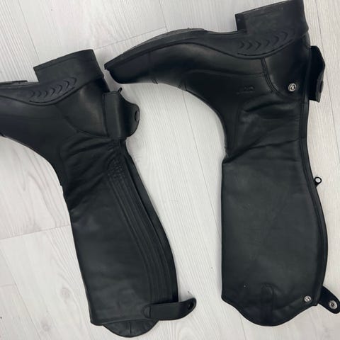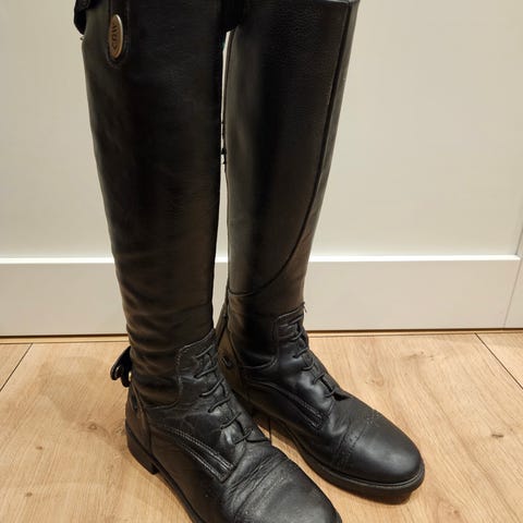 CRW Brandon ratsastussaappaat, koko 37. Saappaat ovat mustaa nahkaa ja niissä on vetoketju sivussa. Pohjat ovat kuvioidut tarjoamaan pitoa. Sopivat ratsastukseen tai muuhun ulkoilukäyttöön.