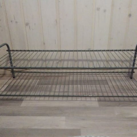 Itsemaalattu elämää nähnyt kenkäteline; pituus 103cm, korkeus 23cm, leveys 30cm