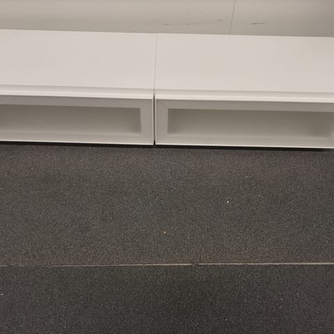 Tammiviilupintainen Muurame MUP 312 TV-taso nelitele viistojaloilla. Taso koostuu kahdesta 156cm leveästä kaapista. Reunoilla vetolaatikot ja keskellä kaapit, joissa lasihyllyt ja alaspäin aukeavat ovet. Päällitason reunassa pari pientä kolhua.