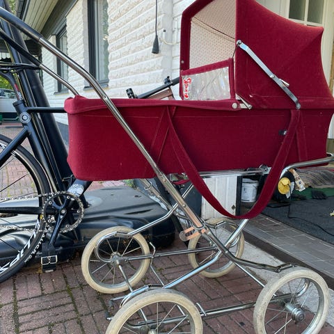 Ora Lastenvaunut vuodelta 1987 eli perinteinen malli sinisellä kankaalla. Isot pyörät helpottavat liikkumista lumisellakin tiellä. Kopan alla iso kori tavaroiden kuljettamista varten. Säilytetty sisätiloissa ja käytetty viimeksi vauvaa parvekkeella nukutettaessa.