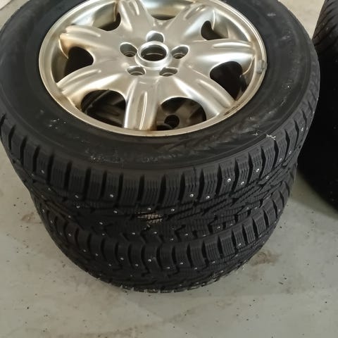 Hyväkuntoiset nastarenkaat hyväkuntoisilla Jaguarin aluvanteilla.Olleet Jaguar S-type autossa käytössä.