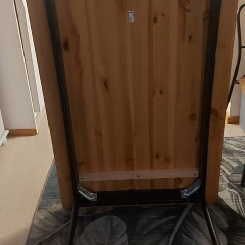 Annetaan pitkään palvellut ruokapöytä, ostettu aikoinaan Askosta muistaakseni. Lapsiperheestä, joten jälkiä nähtävillä. Yhdestä pöydän kulmasta kuva missä halkeama, tämä ei käyttöä ole haitannut ja seinää vasten ei juuri näy.