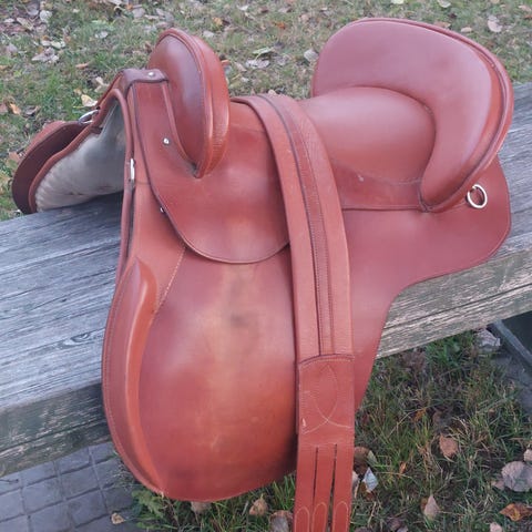 Settiin kuuluu satulan lisäksi leveä rintaremmi, vastinhihnat (lyhyt upouusi) sekä suitset (ilman kuolaimia). Etusatulalaukut ovat irroitettavat. Kuvista poiketen vyö ei kuulu kauppaan.