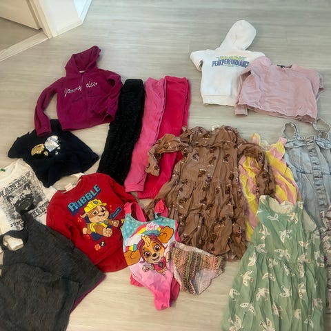 Iso vaatepaketti paitoja, housuja, pitkiä kalsareit, boxereita ja sukkia. Koot 122-134, joku 140 cm on mukana. Sukkien koko 27/33, boxereiden koko 122/128.