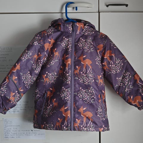 Lilat housut ja vaaleanlila/vaaleanpunainen eläinkuositakki. Jalkarenksut ehjät ja pylly+polvet priimaa.