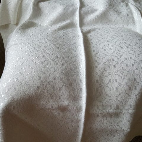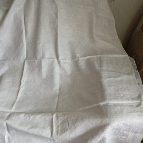 Käsityönä kangaspuilla kudottu pöytäliina. Keskellä sauma. Liina kudottu 2 erässä ja sitten yhdistetty. Kaunis kudottu kuosi. Pellava/Puuvilla.