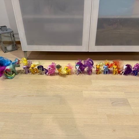Hyväkuntoiset ja tyylitellyt my little pony hahmot myyntiin keräilijän hyllyltä. Keskimmäisen siipeä on alunperin entinen omistaja liimannut takaisin ja lisääkin voisi liimata mutta pysyy kuitenkin paikallaan. Muutoin ei vikoja.