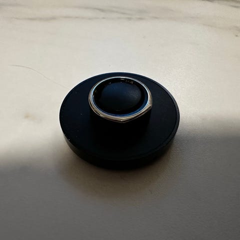Musta Oura-älysormus, koko 8. Toimii moitteettomasti. Pientä käytön jälkeä kämmenpuolella (kuva).