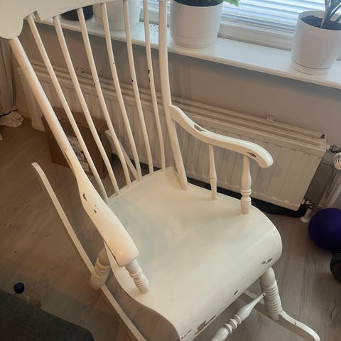 Tukeva, varmaan kotimainen puinen keinutuoli. Älyttömän hyvä istua.