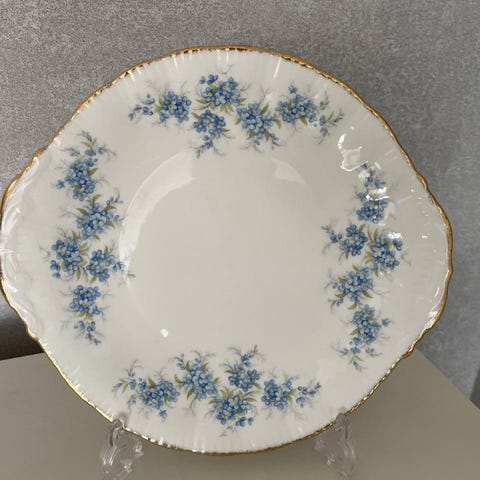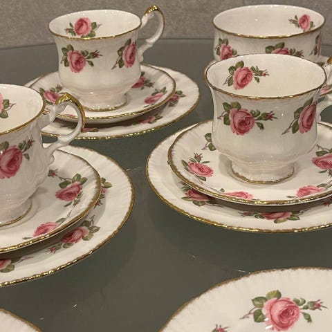 Englantilainen Paragon -luuposliini, herkkä ruusukuvio ja kultareuna.
