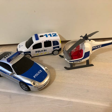 Setti erimaisia poliisin autoja / ajoneuvoja. Osa jo hyvinkin leikittyjä, hinausautosta puuttuu eturenkaat ja se on rikki. Muiden renkaat pyörivät. Ääniä varmaan jostain joskus kuulunut, mutta ei enää.