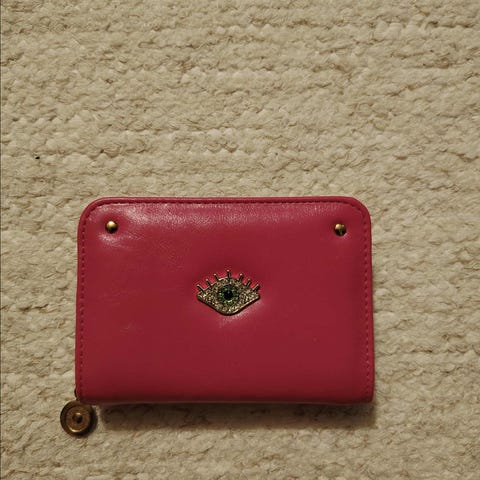 Muodikas ja käytännöllisen kokoinen lompakko synteettisestä materiaalista. Suljenta vetoketjulla. Koristeena strassein somisteltu kullanvärinen metallikoriste (silmä).
