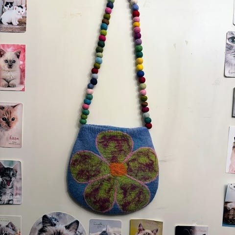 Söpö vaaleansininen itse tehty ja vuoritettu huovutettu olkalaukku