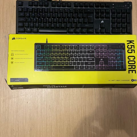Corsair K55 RGB Pro Gamingnäppäimistö, johon kuuluu USB-liitäntä ja RGB-taustavalo. Näppäimistö on mekaaninen ja suunniteltu pelaamiseen, sisältäen ohjelmoitavat näppäimet ja mukautettavat valaistusasetukset.
