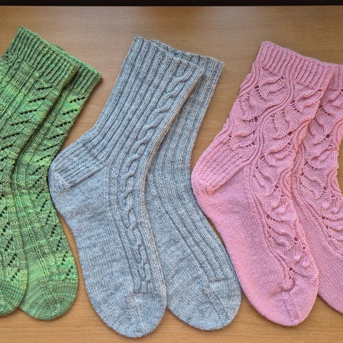 Uusia villasukkia, kaikki neulottu sukkalangasta 75 % villa (superwash), 25 % nylon.