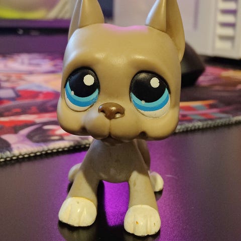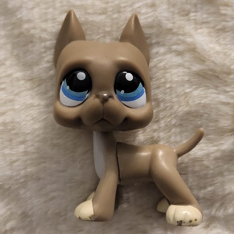 Littlest Pet Shopin tanskandoggi, jossa on valkoinen ja ruskea väriyhdistelmä. Leluhahmon koko on pieni, ja se on valmistettu muovista. Soveltuu keräilyyn tai leikkimiseen.