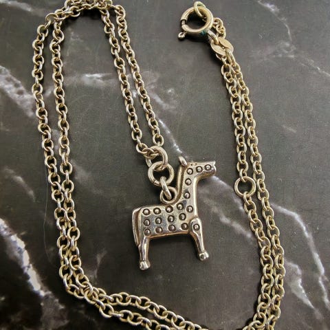 Hopeinen Kalevala Korun Runoratsu riipus ja ketju. Ketjun pituus 44 cm.