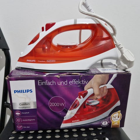 Uusi, alkuperäisessä paketissaan oleva Philipsin steam iron, höyrysilitysrauta.