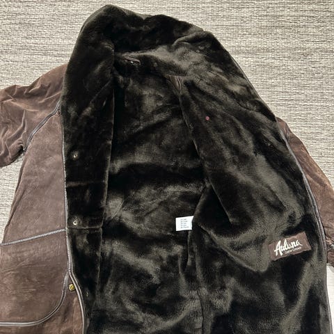 Tummanruskea mokkatakki, jossa sisävuori teddykangasta.