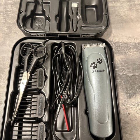 Siisti hyväkuntoinen eläintenhoitosetti/karvaleikkuri+ohjekirja ja säilytyskotelo. Nouto