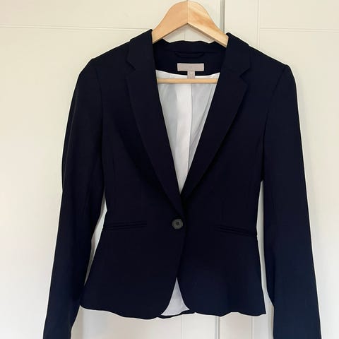 H&M tummansiniset puvun housut naisten koossa 34. Malli on klassinen ja istuva, jossa on vyölenkit.