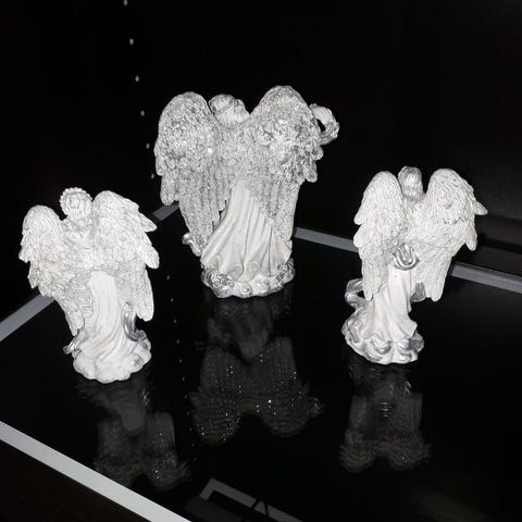 Täysin ehjät ja siistit ohuesta pahvista tehdyt enkelinkuvat, kuvat molemmin puolin. 20 enkeliä ja muutama kultalanka ripustuslenkiksi.
