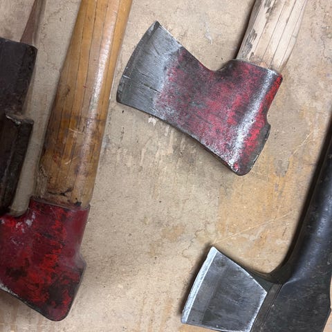Monipuolinen työkalusarja kirveillä, vasaroilla ja saha pari vääntörautaa yms….