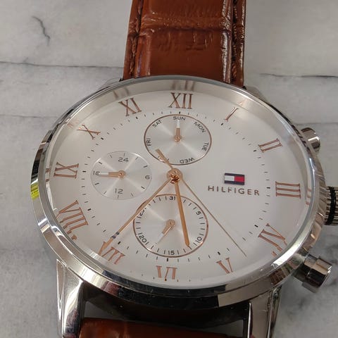 Tommy Hilfiger miesten rannekello, jossa on ruskea nahkaranneke ja tummansininen kellotaulu. Kellon runko on pyöreä ja kullanvärinen. Kello sopii arkipäivän käyttöön ja tarjoaa klassisen tyylin ajan mittaamiseen.
