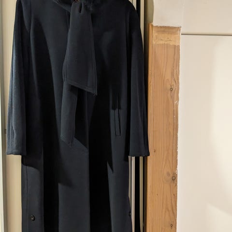 Harmaa polvipituinen villakangastakki,aito turkis irrotettavassa hupussa